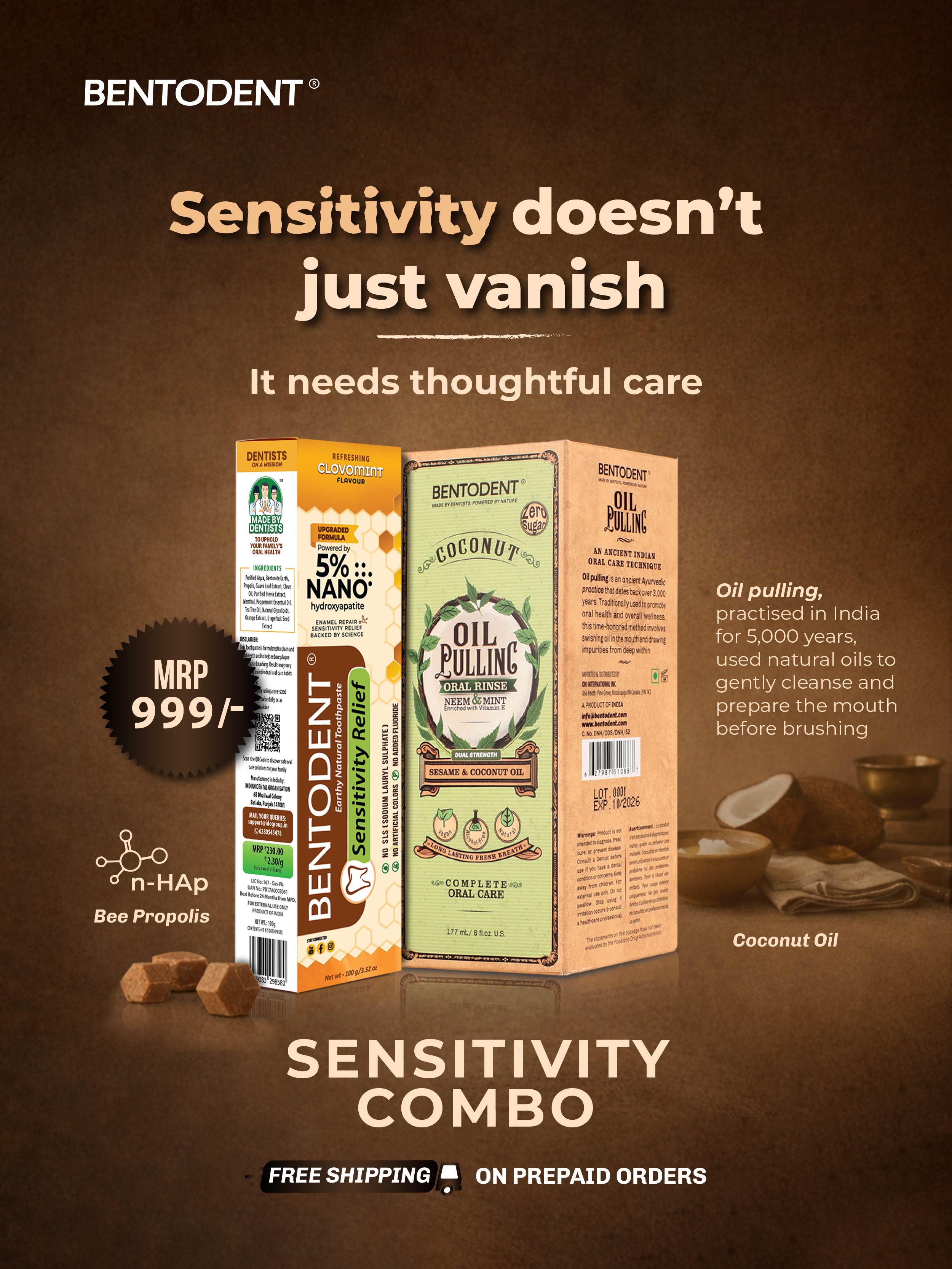 Bentodent Sensitivity Relief Toothpaste with Oil Pulling oral rinse gently cleanses and prepares the mouth before brushing Combo